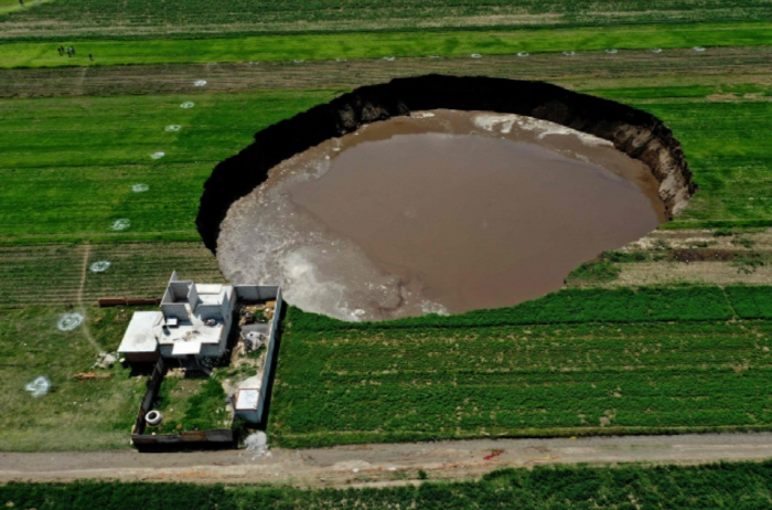 - 지름 약 126m, 깊이 약 20m의 거대한 싱크홀이 형성되었습니다.